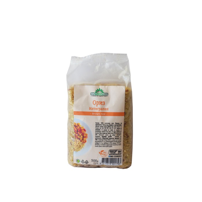 Состав: Интеграле ориз. Земја на потекло: Македонија. Пакува и дистрибутира: Аронија здрава храна ДОО, бул. Кочо Рацин 14 Скопје. Тел. 043 235 959. Енергија 361 Kcal, протеини 7,5гр, јагленихридрати 75гр, од кои шеќери 2,5гр, масти 2,2гр, од кои заситени 0,4гр, влакна 4гр. Употреба: Се додава во чорби, во варива, се користи наместо бел ориз. Да се вари додека не омекне. Да се чува на суво место.
