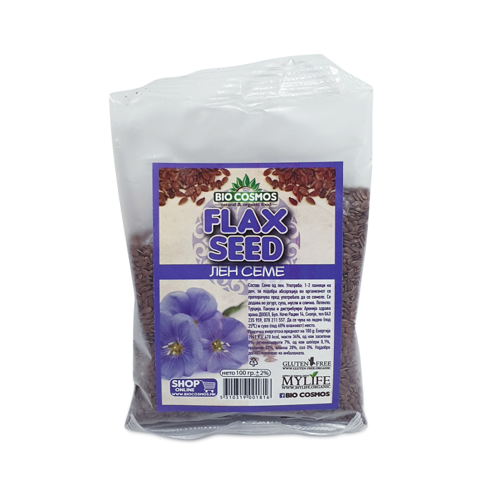 Состав: Лен семе. Земја на потекло: Турција. Енергија 534 kcal, протеини 18гр, јагленихидрати 29гр, од кои шеќери 2гр, масти 42гр, од кои заситени 4гр, влакна 27гр. Да се чува на суво место. Дистрибуира: Аронија здрава храна ДОО, Кочо Рацин 14 Скопје. Тел. 043 235 959.