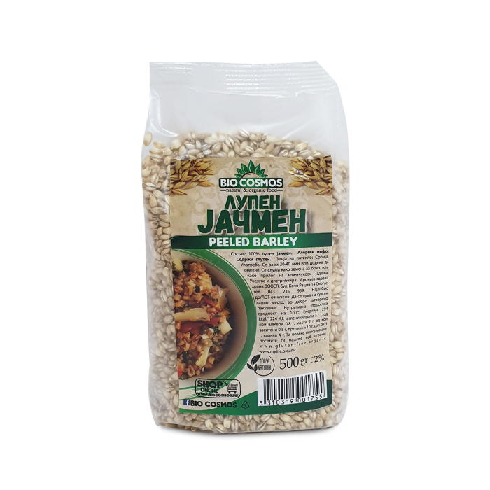 Состав: 100% лупен јачмен. Алерген инфо: Содржи глутен. Земја на потекло: Србија. Употреба: Се вари 30-40 минути додека да омекне. Се служи како замена за ориз, или како прилог на зеленчукови јадења. Увезува и дистрибуира: Аронија здрава храна ДООЕЛ, бул. Кочо Рацин 14 Скопје, тел.: 043 235 959. Да се чува на суво и ладно место, во добро затворено пакување. Нутритивна просечна вредност на 100г: Енергија 294kcal/1224KJ, јагленхидрати 57гр, од кои шеќери 0.8гр, масти 2гр, од кои заситени 0.5гр, протеини 10гр, сол 0,03гр, влакна 4гр.
