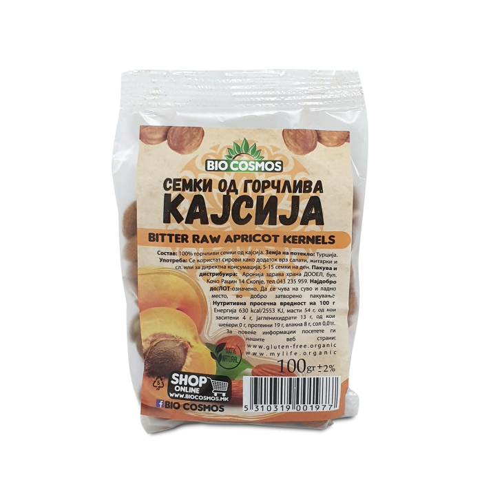 Состав: 100% горчливи семки од кајсија. Земја на потекло: Турција. Употреба: Се користат сирови како додаток во салати, житарки и сл. или за директна консумација, 5-15 семки на ден. Пакува и дистрибуира. Аронија здрава храна ДООЕЛ, бул. Кочо Рацин 14, 100 Скопје. Тел. 078 211 557. Да се чува на суво и ладно место во добро затворено пакување. Нутритивна просечна вредност на 100г. : Енергија 630 kcal/2553 KJ, масти 54г, од кои заситени 4г, јагленихидрати 13г, од кои шеќери 0г, протеини 19г, влакна 8г, сол 0,01.