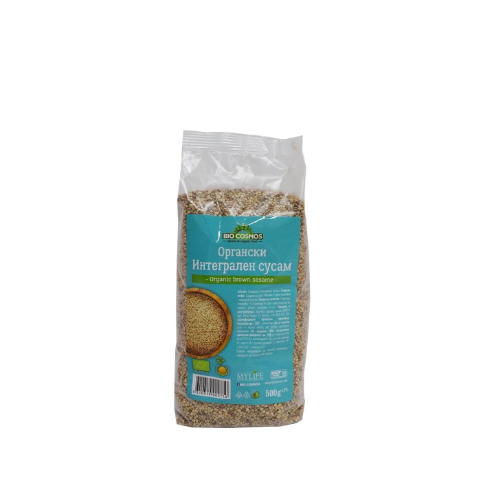 Состав: Органски интегрален сусам. Алерген инфо: Содржи сусам. Можна е крос-контаминација со глутен. Земја на потекло: Парагвај. Употреба: 1-2 лажици на ден, како додаток во салати, јогурт, житарки и сл. Увезува и дистрибуира: Аронија здрава храна ДОО, бул. Кочо Рацин 14 Скопје, тел 043 235 959. Да се чува на суво и ладно место, во добро затворено пакување. Не содржи ГМО. Нутритивна просечна вредност на 100г: Енергија 594 kcal/2371 КЈ, јагленихидрати 12 г, од кои шеќери 0 г, масти 50 г, од кои заситени 7 г, протеини 18 г, сол 0,03 г, влакна 12 г.