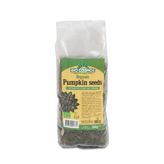 Состав: Органско семе од тиква. Алерген инфо: Можна е крос-контаминација со глутен. Земја на потекло: Кина. Употреба: 1-2 лажици на ден, како додаток во салати, јогурт, житарки и сл. Увезува и дистрибуира: Аронија здрава храна ДООЕЛ, бул. Кочо Рацин 14, 1000 Скопје, тел. 078 211 557. Сертифициран органски производ од Балкан Биосерт Скопје, според МК закон за ОЗ и IACB стандард. Најдобро до/ЛОТ - отпечатено на амбалажата. Да се чува на суво и ладно место, во добро затворено пакување. Не содржи ГМО. Нутритивна просечна вредност на 100г. : Енергија 585 kcal/2407 KJ, јагленихидрати 18г, од кои шеќери 1г, масти 45г, од кои заситени 7г, протеини 25г, сол 0,002г, влакна 4г.