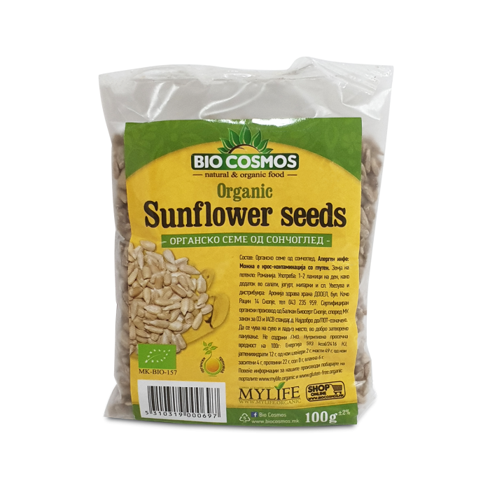 Органско семе од сончоглед (100гр.) Состав: Органско семе од сончоглед. Алерген инфо: Можна е крос-контаминација со глутен. Земја на потекло: Романија. Употреба: 1-2 лажици на ден, како додаток во салати, јогурт, житарки и сл. Увезува и дистрибуира: Аронија здрава храна ДООЕЛ, бул. Кочо Рацин 14, 1000 Скопје. Тел. 078 211 557. Сертифициран органски производ од Балкан Биосерт Скопје, според МК закон за ОЗ и IACB стандард. Најдобро до.. Category: Product #: 00697 Regular price: 73 ден. 73 Available from: Aronija zdrava hrana ДООЕЛ