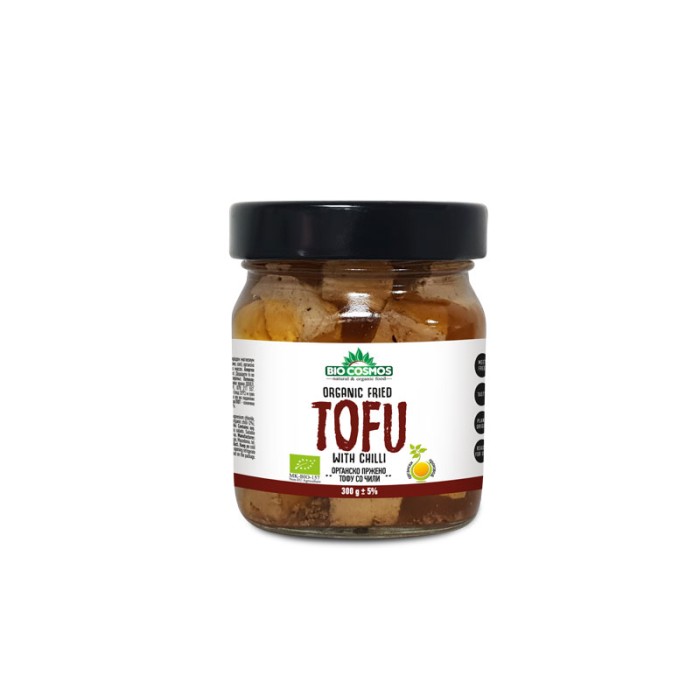 Состав: Органско тофу (органскo соино млеко, природен магнезиум хлорид, вода), органски тамари соја сос (соја, вода, мирин, сол), органско чили (2%), органски црн бибер, органско сончогледово масло. Алерген инфо: Содржи соја. Употреба: Сервирајте го како прилог. Додадете го во салати. Погодна замена за фета или друго бело сирење. Потекло: Македонија. Произведува и дистрибуира: Аронија здрава храна ДООЕЛ, Бул. Кочо Рацин 14, 1000 Скопје, тел 043 235 959, 078 211 557. Сертифициран органски производ. Да се чува на ладно (под 25⁰C) и суво (под 60% влажност) место. После отворањето да се чува во во ладилник (5-8⁰C) и да се искористи во рок од 3-5 дена. Најдобро до/ЛОТ - означено на амбалажата. Тежина на тофу во амбалажата: 160 g ±5%.