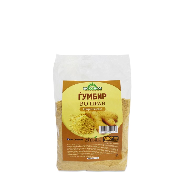 Состав: 100% ѓумбир во прав. Земја на потекло: Индија. Употреба: Како природен зачин во исхраната. Се додава во колачи, шејкови и сл. или се вари и процедува за да се добие чај. Се дозира по вкус. Пакува и дистрибуира: Аронија здрава храна ДООЕЛ, бул. Кочо Рацин 14 Скопје, тел 043 235 959. Најдобро до / ЛОТ - отпечатено на амбалажата. Да се чува на суво, темно и ладно место во добро затворено пакување. Нутритивна просечна вредност на 100г: Енергија 89 Kcal/377 KJ, јаглехидрати 17,5 – 17,9 г, од кои шеќери 0 – 2,7 г, масти 0 – 2,2г, од кои заситени 0 – 1г, протеини 0 – 3,8г, сол 0,01г, влакна 0 - 5г.