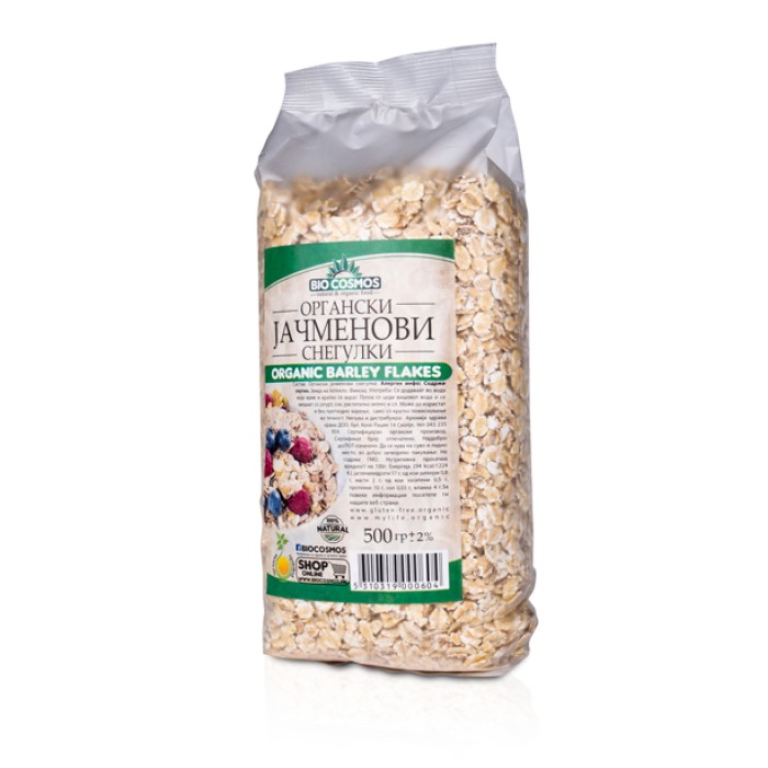 Состав: Јачменови снегулки. Алерген инфо: Содржи глутен. Земја на потекло: Германија. Употреба: Се додаваат во вода која врие и кратко се варат. Потоа се цеди вишокот вода и се мешаат со јогурт, сок, растително млеко и сл. Може да користат и без претходно варење, само со кратко покиснување во течност. Увезува и дистрибуира: Аронија здрава храна ДООЕЛ, бул. Кочо Рацин 14 Скопје, тел 043 235 959. Сертифициран органски производ. Сертифицирано од Балкан Биосерт Скопје, според МК занон за ОЗ и IACB стандард. Да се чува на суво и ладно место, во добро затворено пакување. Нутритивна просечна вредност на 100г: Енергија 294 kcal/1224 KJ, јагленихидрати 57 г, од кои шеќери 0,8 г, масти 2 г, од кои заситени 0,5 г, протеини 10 г, сол 0,03 г, влакна 4 г.