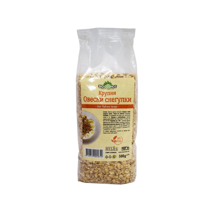 Состав: Овесни крупни снегулки. Алерген инфо: Содржи глутен. Земја на потекло: Германија. Употреба: Се додаваат во јогурт, сок, растително млеко и слично. Увезува и дистрибуира: Аронија здрава храна ДОО, бул. Кочо Рацин 14 Скопје, тел. 043 235 959. Да се чува на суво и ладно место, во добро затворено пакување. Нутритивна просечна вредност на 100гр: енергија 372kcal/1566KJ, јагленихидрати 58гр, од кои шеќери 0.7гр, масти 7гр, од кои заситени 1.3гр, протеини 13.5гр, сол 0.007гр, влакна 10гр.
