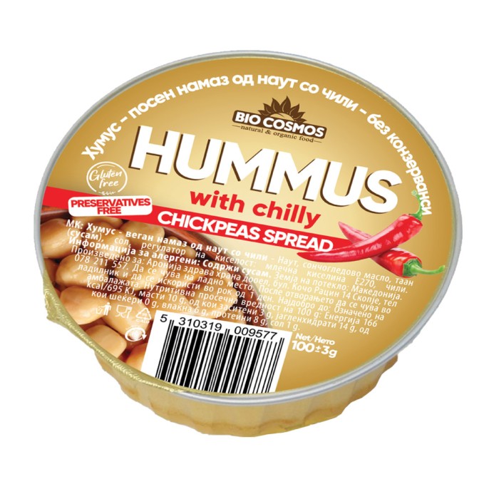 МК: Хумус - веган намаз од наут со чили - Наут, сончогледово масло, таан (сусам), сол, регулатор на киселост: млечна киселина Е270, чили. Информација за алергени: Содржи сусам. Земја на потекло: Македонија. Произведено за: Аронија здрава храна дооел, бул. Кочо Рацин 14 Скопје, тел 078 211 557. Да се чува на ладно место. После отворањето да се чува во ладилник и да се искористи во рок од 1 ден. Најдобро до: Означено на амабалажата. Нутритивна просечна вредност на 100 g: Енергија 166 kcal/695 KJ, масти 10 g, од кои заситени 3 g, јагленхидрати 14 g, од кои шеќери 0 g, влакна 6 g, протеини 8 g, сол 1 g.