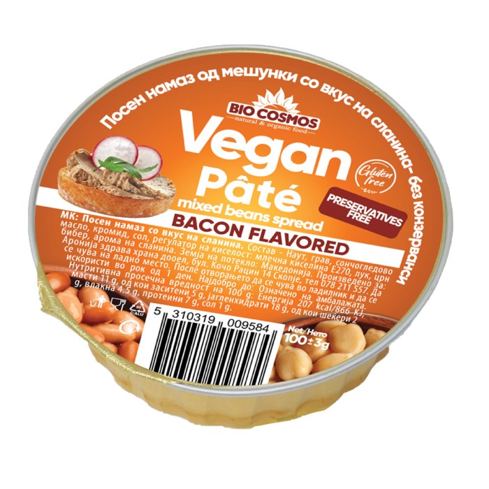 МК: Посен намаз со вкус на сланина. Состав - Наут, грав, сончогледово масло, кромид, сол, регулатор на киселост: млечна киселина Е270, лук, црн бибер, арома на сланина. Земја на потекло: Македонија. Произведено за: Аронија здрава храна дооел, бул. Кочо Рацин 14 Скопје, тел 078 211 557. Да се чува на ладно место. После отворањето да се чува во ладилник и да се искористи во рок од 1 ден. Најдобро до: Означено на амабалажата. Нутритивна просечна вредност на 100 g: Енергија 207 kcal/866 KJ, масти 11 g, од кои заситени 5 g, јагленхидрати 18 g, од кои шеќери 2 g, влакна 4.5 g, протеини 7 g, сол 1 g.