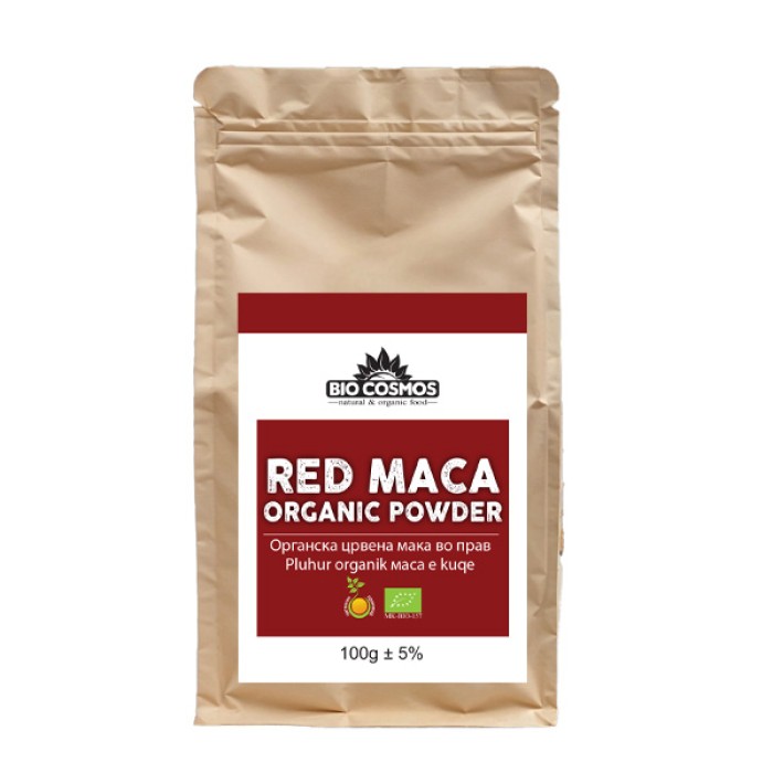 Состав: 100% Органска црвена мака во прав, сурова. Латинско име: Lepidium meyenii. Потекло на суровината: Перу. Мака е корен сличен на репка која расне на високите Анди, и која локалното население ја користи како храна илјадници години. Црвената мака има црвена лушпа но белузлав внатрешен дел, па правот кој се добива со нејзино сушење и мелење е кремаст со блага розе нијанса. Начин на употреба: 1-3 мали лажички на ден, се раствора во вода или друг напиток по желба, може да се додаде во смуди или разни сурови десерти. Увезува и дистрибуира: Аронија здрава храна ДООЕЛ, бул. Кочо Рацин 14 Скопје, тел 043 235 959. Сертифициран органски производ. Сертифицирано од Балкан Биосерт Скопје, според МК занон за ОЗ и IACB стандард. Да се чува на суво и ладно место, во добро затворено пакување. Не содржи ГМО. Нутритивна вредност на 100г: Енергија 357 kcal/1467 KJ, јагленихидрати 61 г, од кои шеќери 25 г, масти 2,5 г, од кои заситени 1,8 г, протеини 11 г, натриум 0,098 г, влакна 5 г.